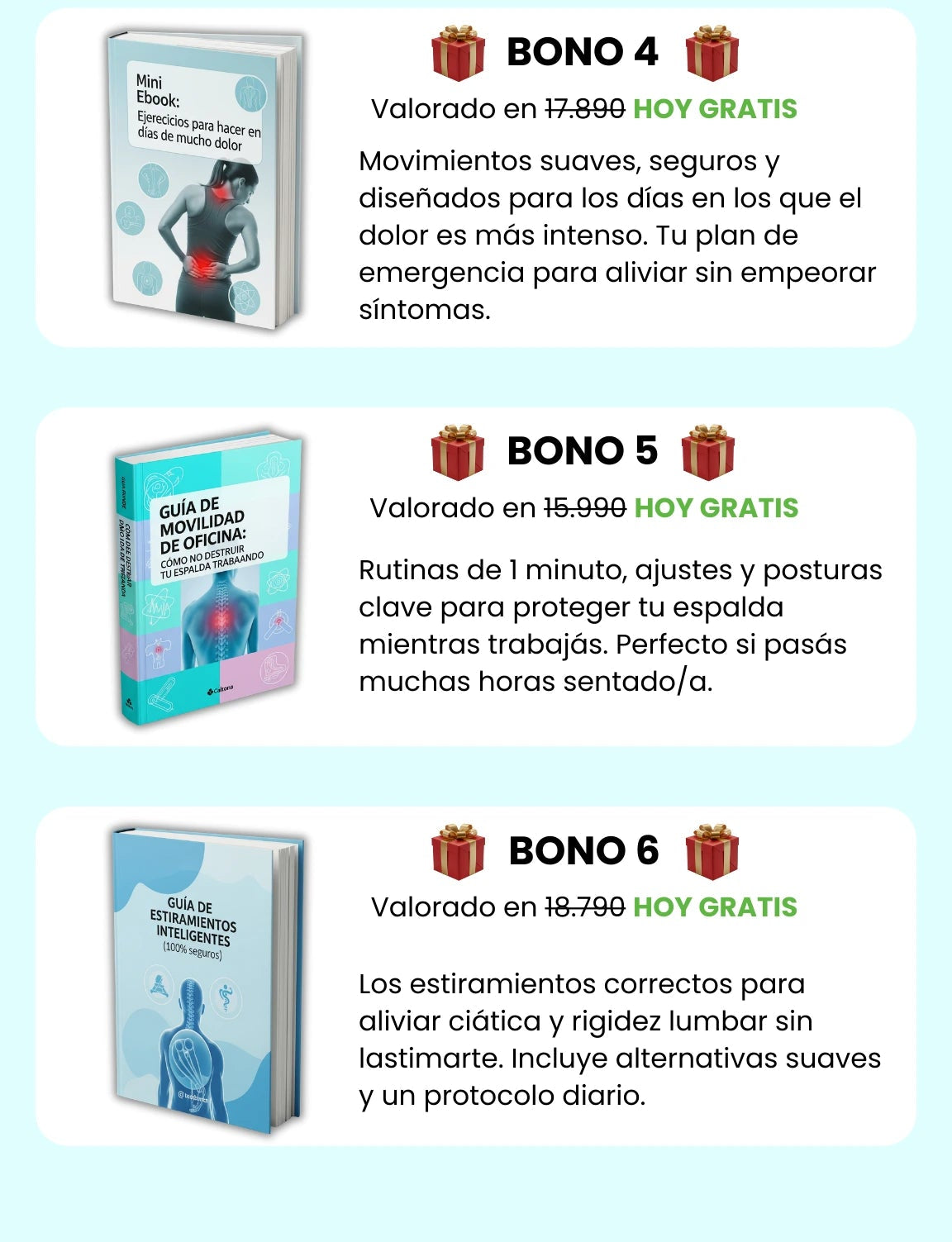 Vas a recibir el Ebook Libertad Lumbar + los 6 bonos de regalo. Todo en formato PDF. Y tienes acceso de por vida, el material es 100% tuyo.